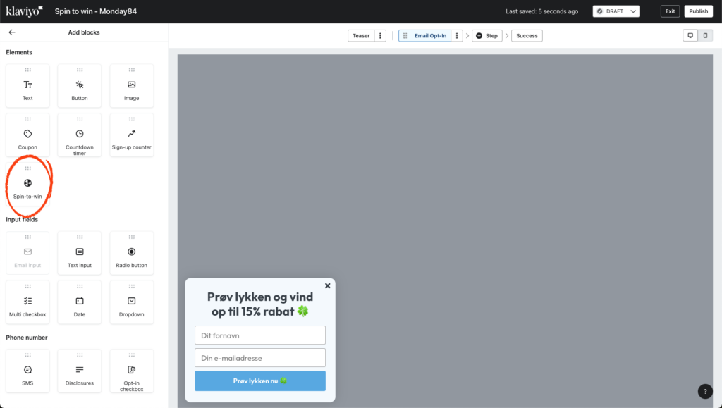 Det er ret lige til at komme i gang med deres lykkehjul. Når man laver en tilmeldingsformular i Klaviyo, er det egentligt bare en ekstra block, nemlig selve lykkehjulet, som skal tilføjes:
