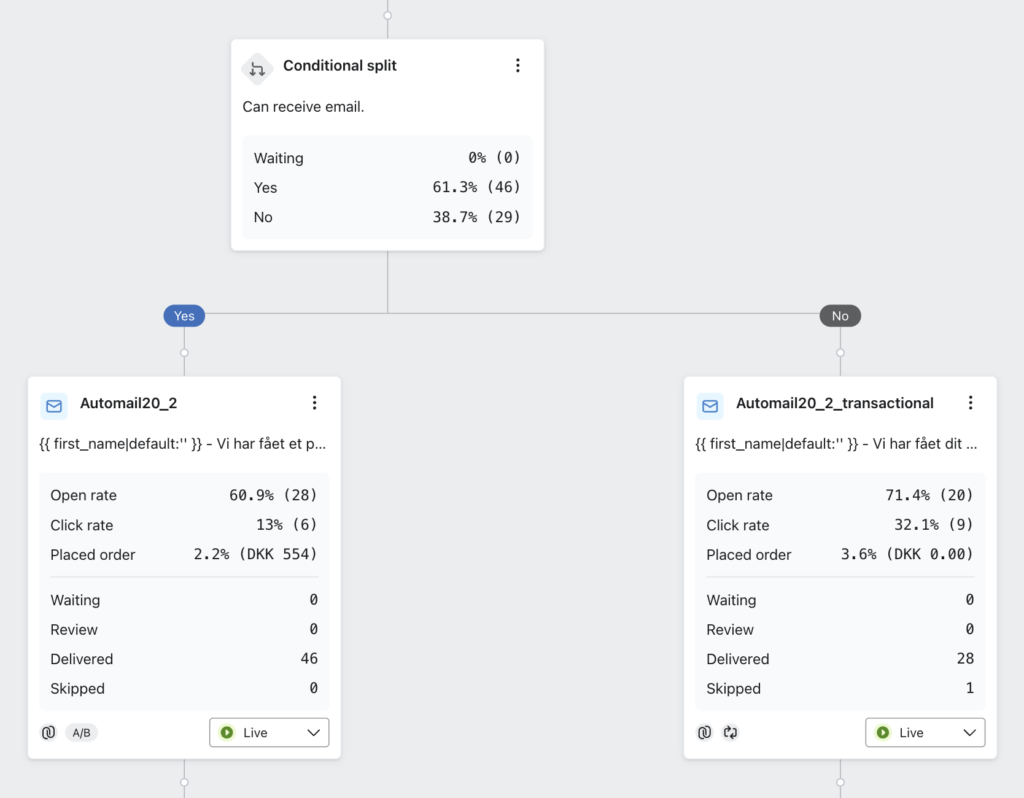I mange tilfælde laver vi to forskellige spor i vores flows, alt efter om vi har permission på dem eller ej. Det kan f.eks. være i back in stock, hvor vi til dem, der er permission på har en version med lidt mere gas på marketing, men vi til dem, der ikke er permission på, har en mere direkte mail.
